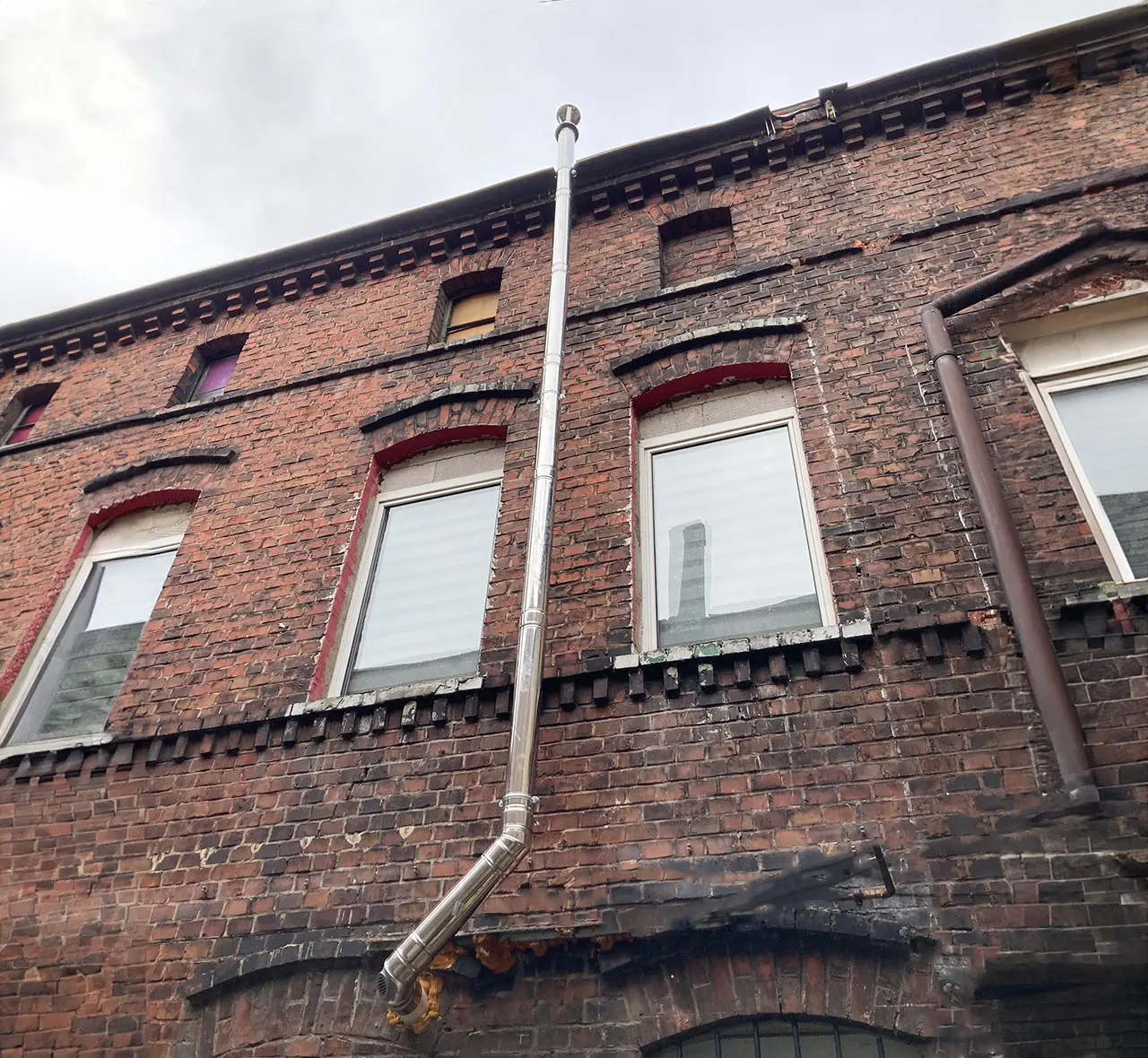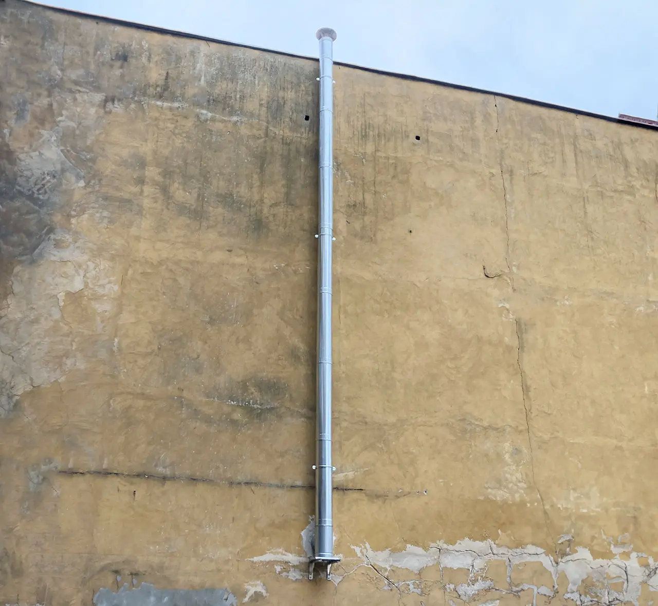W tej realizacji zamontowaliśmy nowy stalowy komin na zewnętrznej ścianie murowanego budynku. Prace obejmowały instalację komina biegnącego od poziomu okien aż po dach.