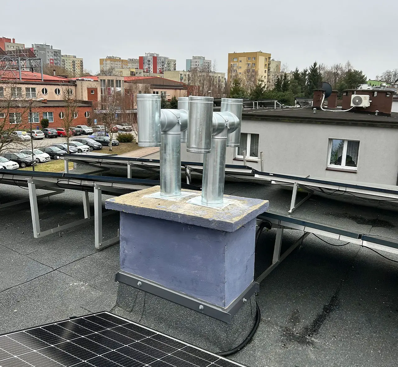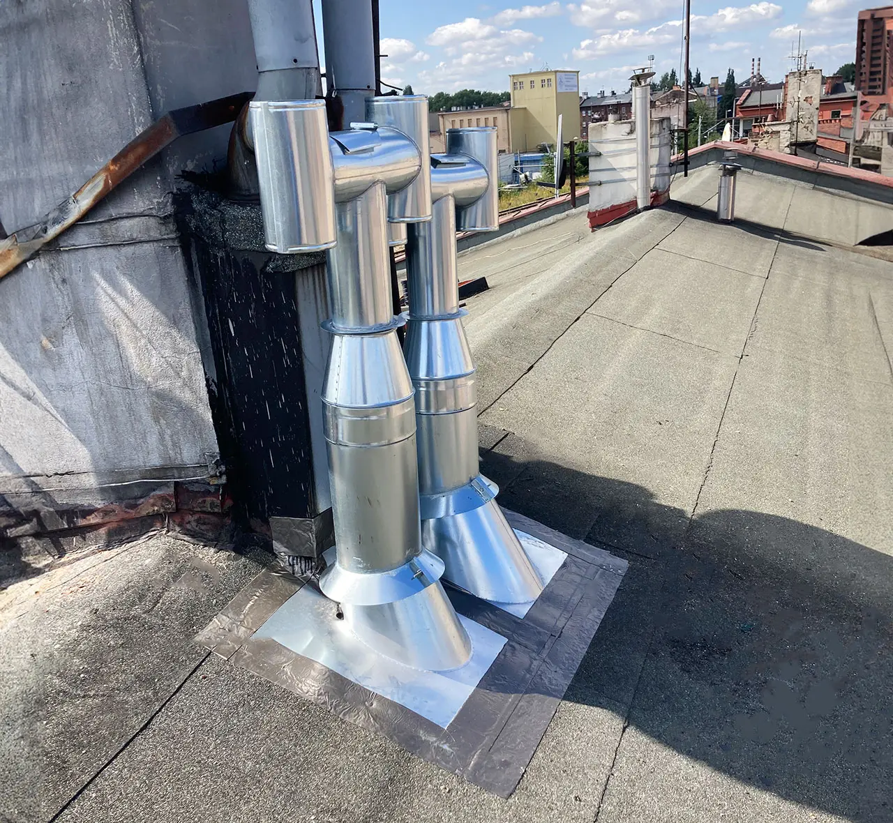 W ramach tej realizacji zainstalowaliśmy nowe stalowe kominy na dachu budynku. Prace obejmowały montaż profesjonalnych nasad kominowych, które zapewniają optymalną wentylację i bezpieczeństwo pomieszczeń.